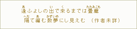(逢うべき機会が訪れるまでは、せめて敷き薦の編目のように詰めて、幾度でもあなたの夢の中に現れましょう)と、薦畳のこまやかな編目の姿に比喩させて、恋しき人の夢の多さを切々と詠じております。