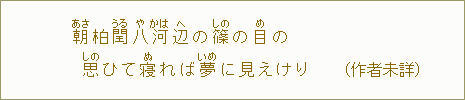 (朝の柏がうるおう閏八河の岸の小竹の芽のように、恋しき人を偲んで寝たから夢に見えたことだ)と、「朝柏」は、朝の柏の葉が朝露にぬれて、