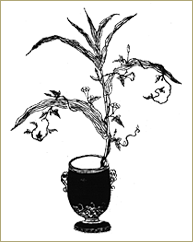 いけばな古書からは、実の出る前の黍の撓 み葉に、朝顔の蔓が延いまとわり、如何にも逢瀬を意する男女の仲睦まじさを感じさせる花としていけ表されています。図版[Ⅱ]を参照。尚、こうした粟や黍の五穀は「生けることは憚