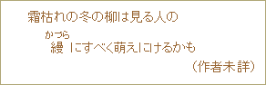 (霜枯れの冬の柳は、見る人が縵にできるように芽ぶき出したことだ)と歌われ、春に向けて着々と芽を吹き出し、その生命力のある垂柳で
