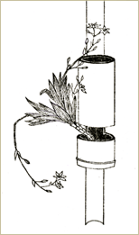 祗園祭に縁りの桧扇をいけたものが古書から拾い出せ、寿老人の銘をもつ掛け花入れに上下に振り咲く桧扇を