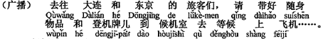 - 大連と東京へご出発(行く)のお客様、身の回りの荷物と搭乗券をお持ちになって、待合室へお越しになり、搭乗をお待ちください。