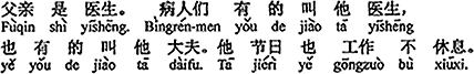 - 父は医者です。患者さんたちのある人は、お父さんの事を「医生(先生)」とも言うし、ある人は「大夫(先生)」とも言う。お父さんは祭日も仕事で、休まない。