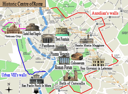 伝説によると双子の兄弟のロムルスとレムスに設立されたローマは最初ローマ共和国の、そしてその後ローマ帝国の中心となり、四世紀にはキリスト教世界の首都となりました。ローマの世界遺産は1990年に教皇ウルバヌス8世城壁まで拡張され、古代の主なモニュメント、例えばフォーラム公共広場、アウグスト皇帝の廟、ハドリアン皇帝廟、パンテオン、トラヤヌス記念柱、マルクスアウレリウス記念柱それに教皇ローマの宗教及び公共建造物も含まれます。