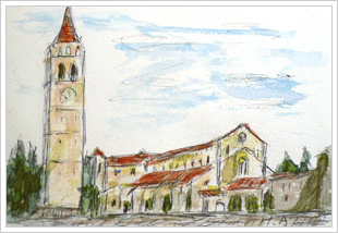 一方、教会の権威はその後も続き、その影響はヴェネチィア、ヒストリアなど30以上の付属司教区にまでに及びました。1019年、偉大な司教ポッポーネ(Poppone)は城壁に囲まれた新しい要塞を築き、港を掘り広げ、古い聖堂の基礎の上に新しい大聖堂(Basilica)を建てました。そしてその政治的権力は、13世紀には最高に達しました。しかし、1420年ヴェネチアとの戦いに敗れ、アクイレイアは衰亡に向かいます。1509年からはオーストリアが支配するようになり、その支配はハプスブルク帝国解体の1918年までの長期間続くことになりました。