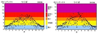 2005年と2015年の気象庁のデータ「日最大UVインデックス(観測値)の年間推移グラフ(観測地:つくば)」を比較してみると、10年間で真夏の紫外線が驚異的に強くなっています。